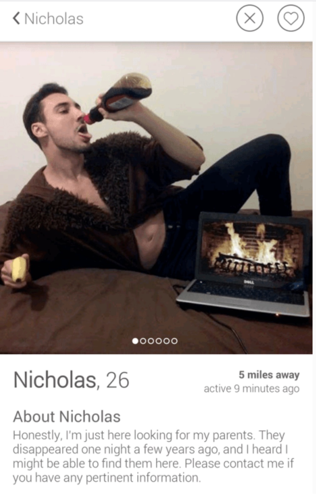 Bio: Went to a party dressed as an egg and got with a guy who was dressed as a chicken. A life on question was answered that night. It was the chicken...