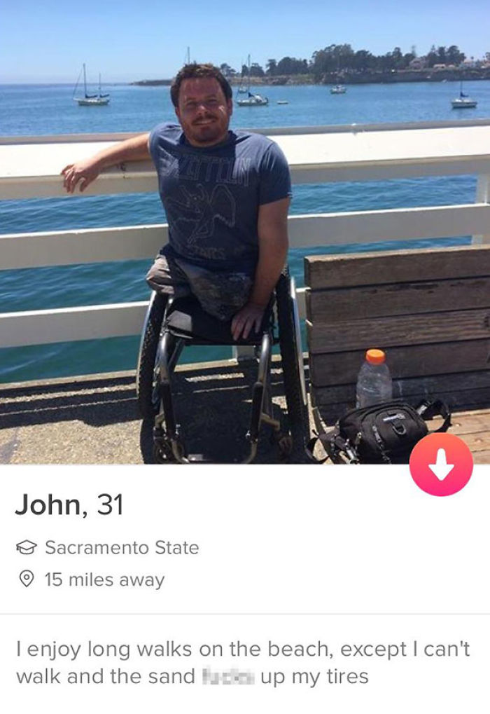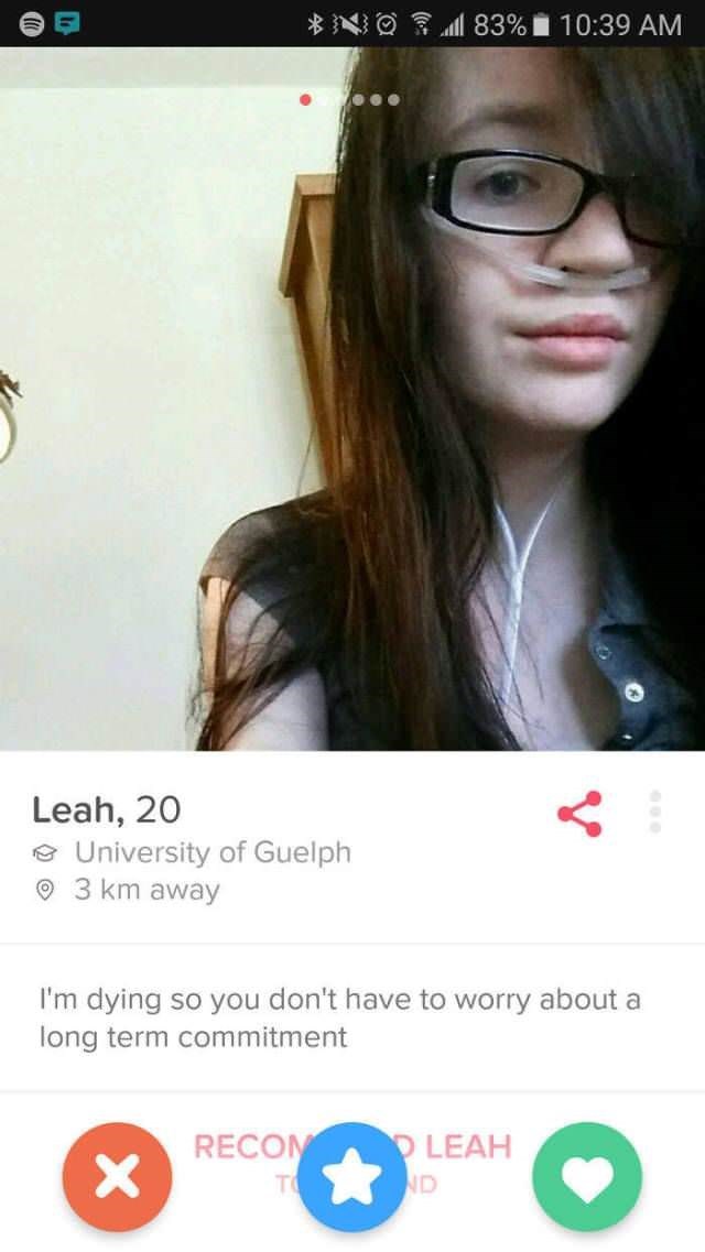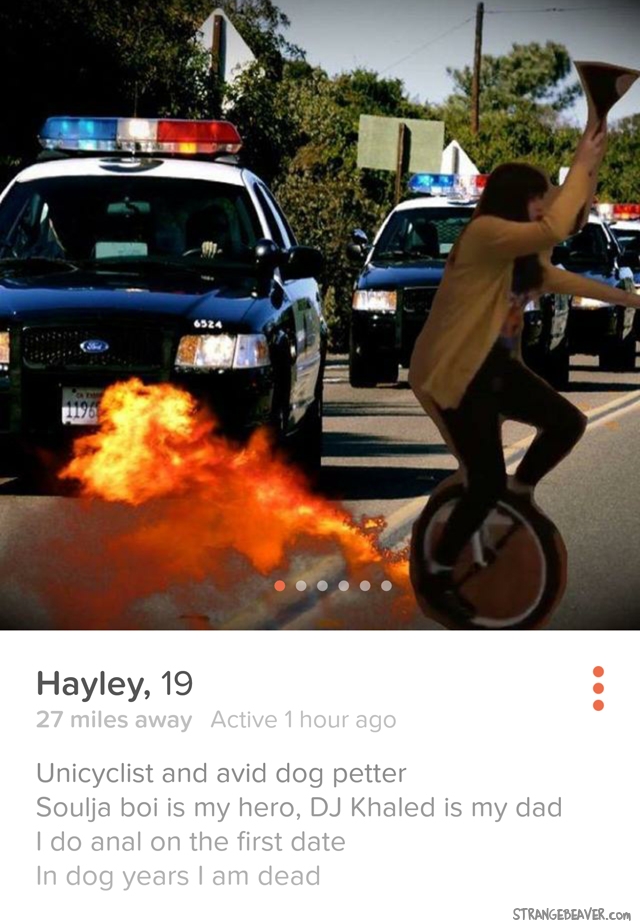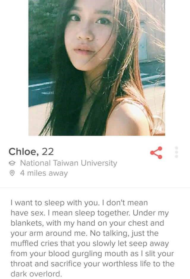 Bio: I enjoy long walks on the beach with my boyfriend, until the acid wears off and I realize i've been dragging a naked mannequin around a Denny's parking lot for 12 hours.