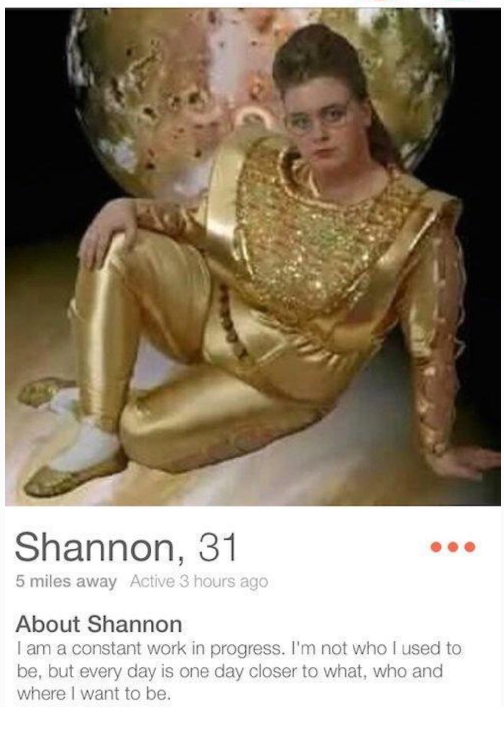 Bio: For the love of God, someone please date me so I can stop bringing my Mom to custume parties.