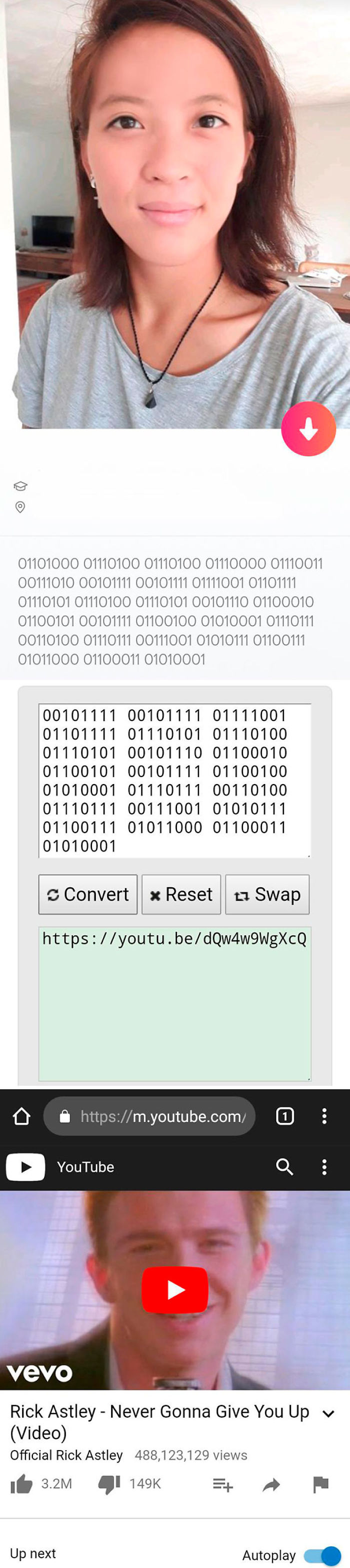 Bio: 01101000 01110100 01110100 01110000 01110011 00111010 00101111 00101111 01111001 01101111 01110101 01110100 01110101 00101110 01100010 01100101 00101111 01100100 01010001 01110111 00110100 01110111 00111001 01010111 01100111 01011000 01100011 01010001