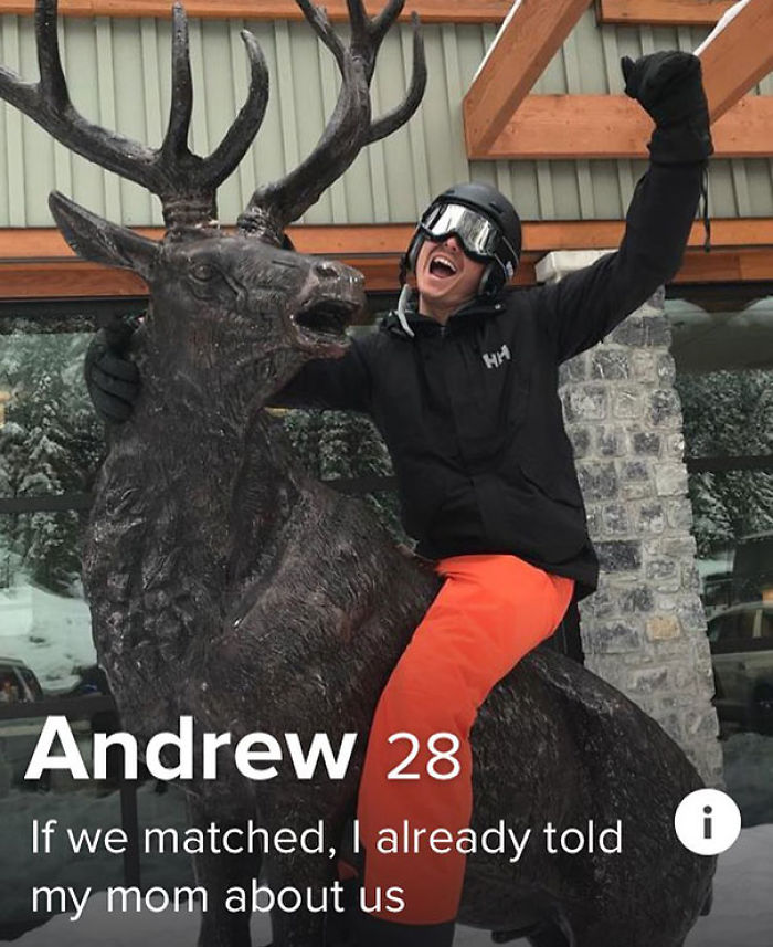 Bio: I'm the kind of guy you can take home to your mum. She'll think I'm charming, kind... And a bit sexy. She falls in love with me... I think I feel the same. We get married. I'm your dad now. I confront you, "young lady, why do you have a Tinder account?" you are now grounded.