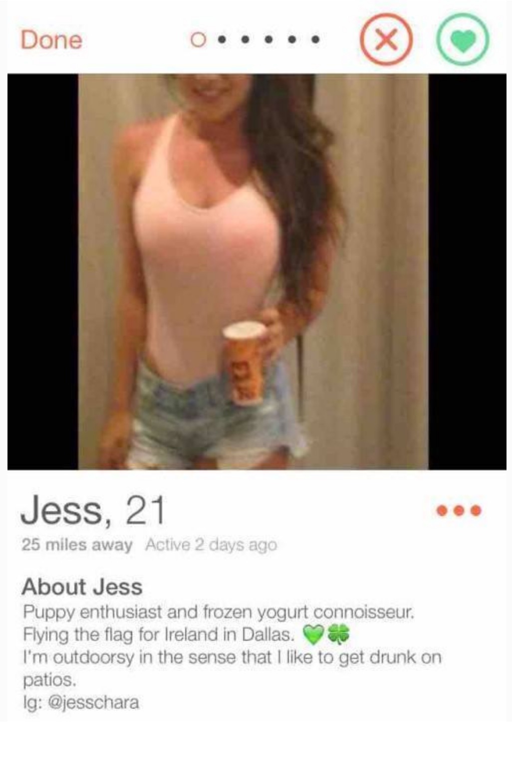 Bio: Puppy enthusiast and frozen yogurt connoisseur. Flying the flag for Ireland in Dallas. I'm outdoorsy in the sense that I like to get drunk on patios. Ig: @jesschara