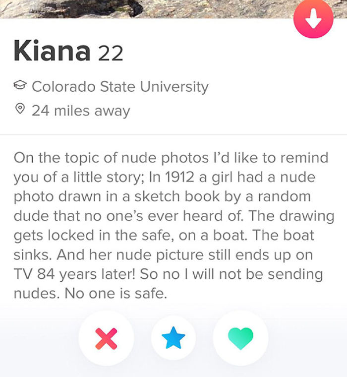 Bio: On the topic of nude photos I'd like to remind you of a little story; In 1912 a girl had a nude photo drawn in a sketch book by a random dude that no one's ever heard of. The drawing got locked in a safe, on a boat. The boat sinks. And her nude picture still ends of on TV 84 years later! So no I will not be sending nudes. No one is safe.