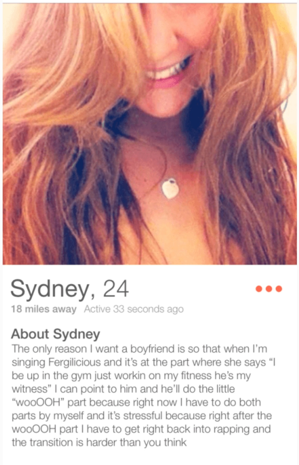 Bio: I enjoy long walks on the beach with my boyfriend, until the acid wears off and I realize i've been dragging a naked mannequin around a Denny's parking lot for 12 hours.