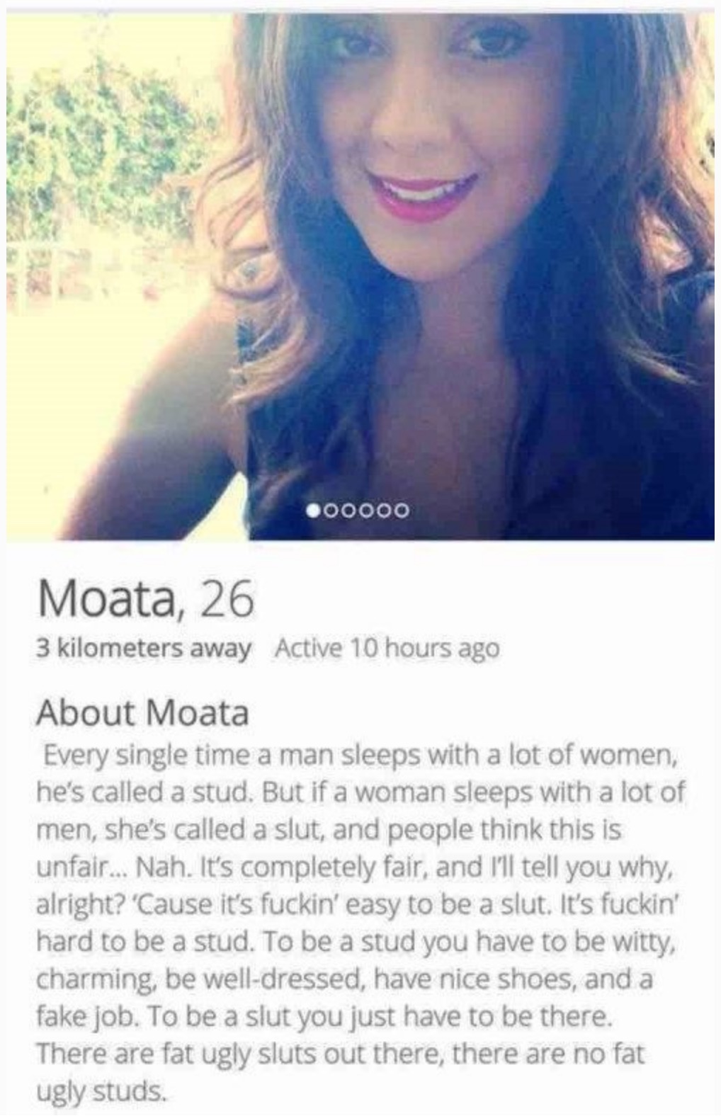 Bio: Every single time a man sleeps with a lot of women, he's called a stud. But if a women sleeps with a lot of men, she's called a slut, and people think this is unfair... Nah. Its completely fair, and I'll tell you why, alright? 'Cause it's fucking easy to be a slut. It's fucking hard to be a stud. To be a stud you have to be witty, charming, be well dressed, have nice shoes, and a fake job. To be a slut you just have to be there. There are fat ugly sluts out there, there are no fat ugly studs.