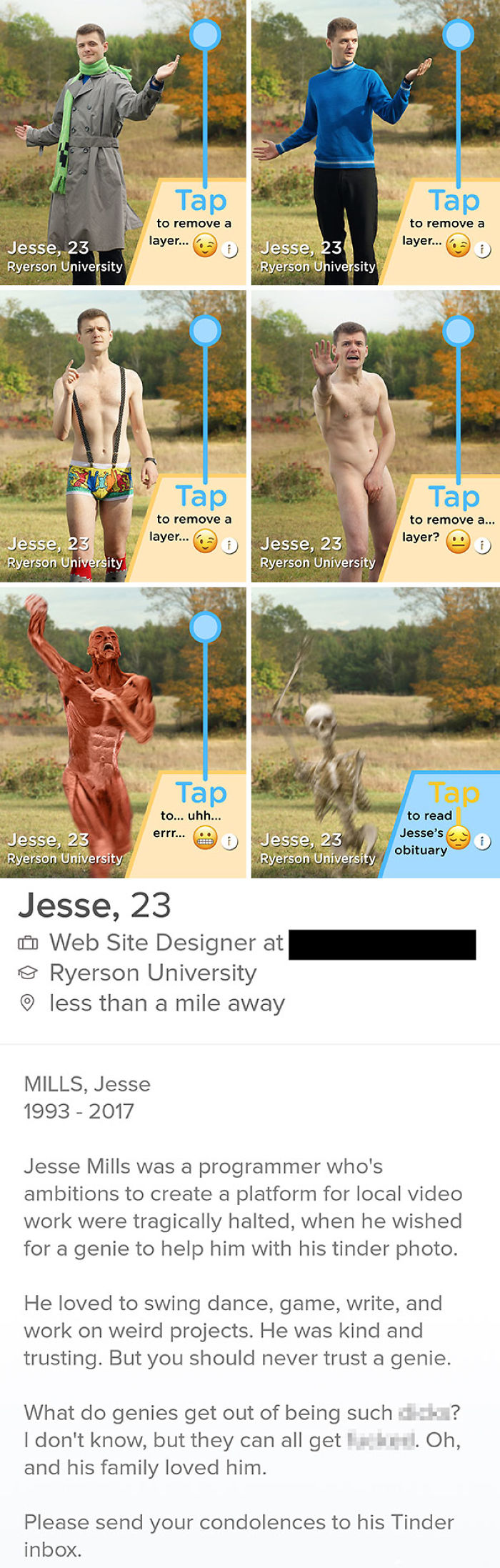 Bio: Jesse Mills was a programmer who's ambitions to create a platform for local video work were tragically halted, when he wished for a genie to help him with his tinder photo. He loved to swing dance, game, write and work on wierd projects. He was kind and trusting. But you should never trust a genie. What do genies get out of being suck dicks? I don't know, but they can all get fucked. Oh, and his family loved him. Please send your condolences to his Tinder inbox.