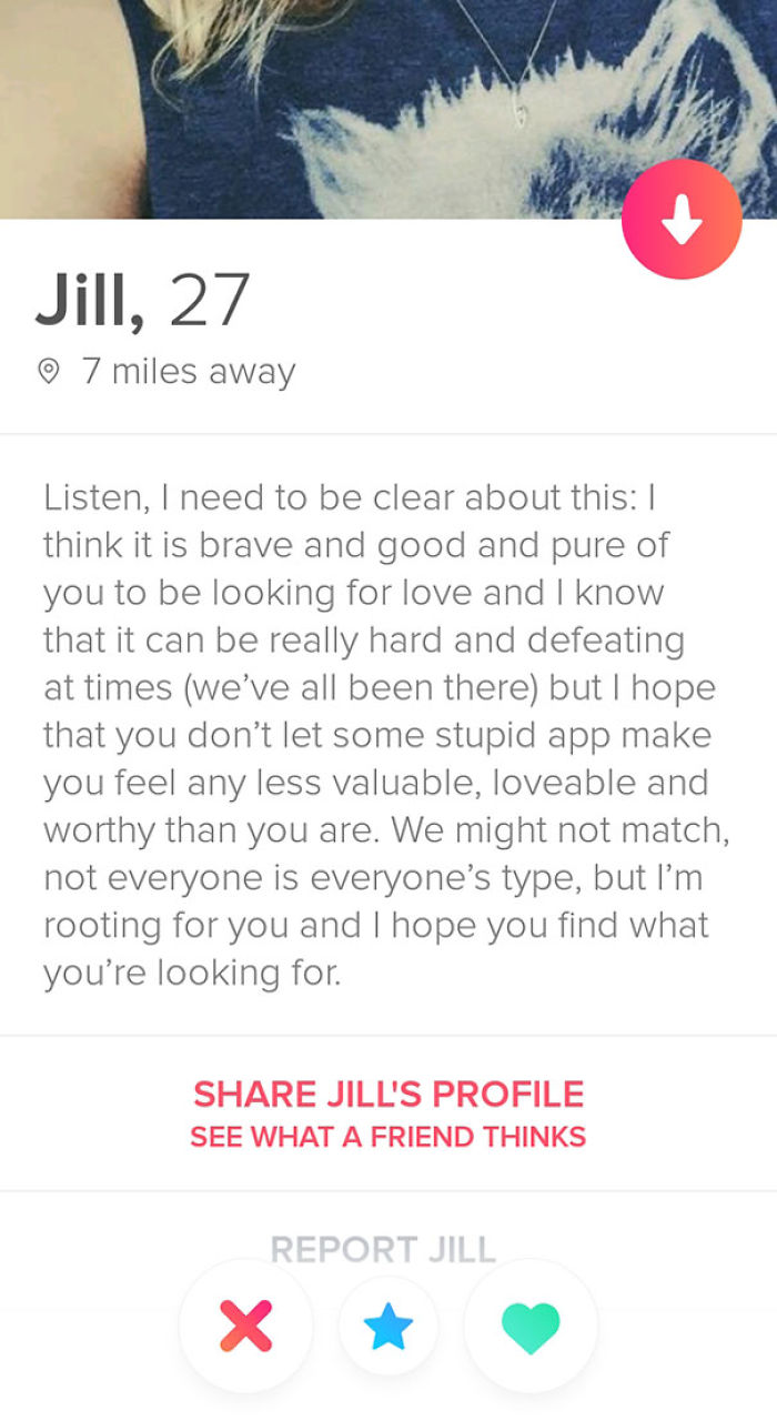 Bio: Listen, I need to be clear about this: I think it is brave and good and pure of you to be looking for love and I know that it can be really hard and defeating at times (we've all been there) but I hope that you don't let some stupid app make you feel any less valuable, loveable and worthy then you are. We might not match, not everyone is everyones type, but I'm rooting for you and I hope you find what you're looking for.