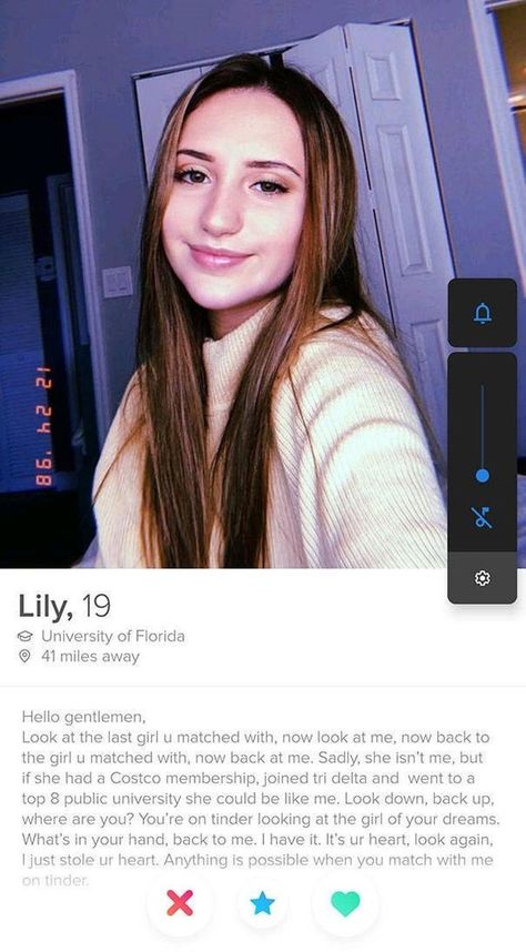 Look at the last girl u matched with, now look at me, now back to the girl you matched with, now back at me. Sadly, she isnt me, but if she had a costco membership, joined tri delta and we to to a top 8 public university she could be like me. Look down, now back up, where are you? You're on tinder looking for the girl of your dreams. What's that in your hand, back to me. I have it. It's ur heart, look again, I just stole ur heart. Anything is possible when you match with me on tinder.