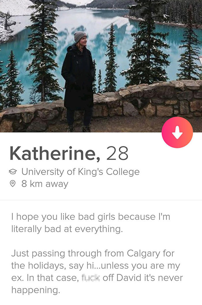 Bio: I hope you like bad girls because I'm literally bad at everything. Just passing through from Calgary for the holidays, say hi... unless you are my ex. In that case fuck off David its never happenning.