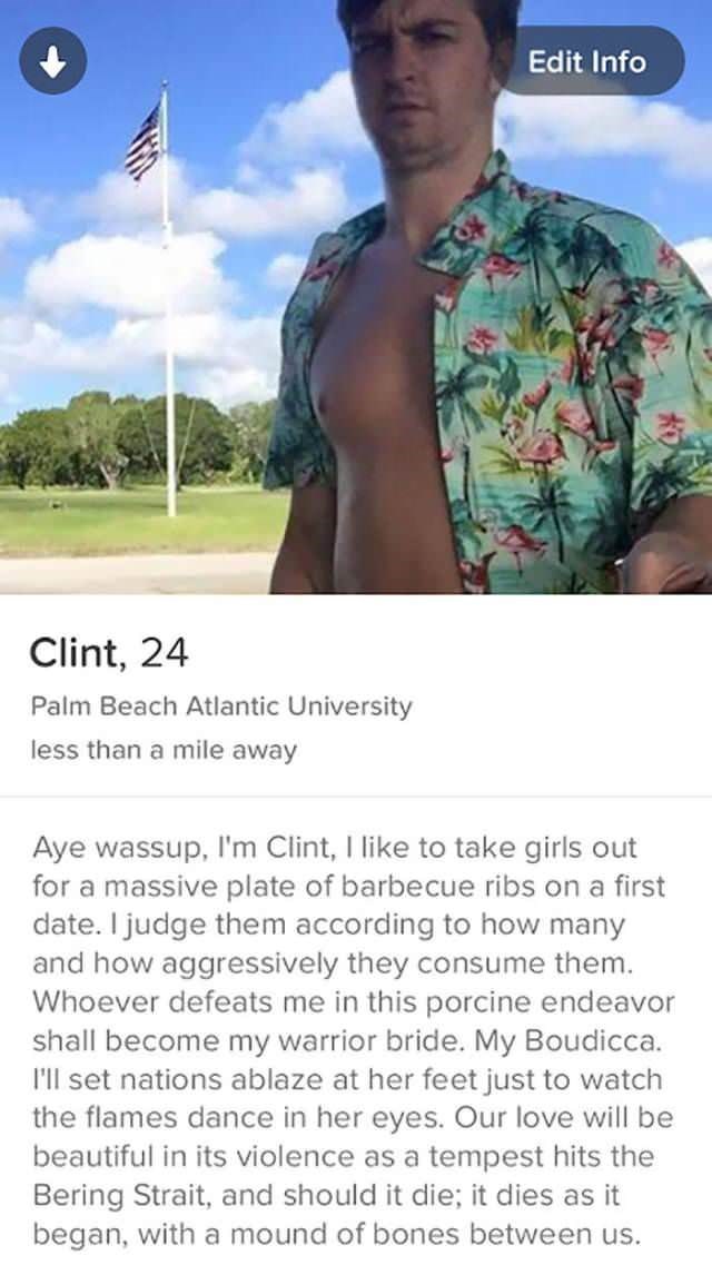 Bio: Aye wassup, I'm clint, I like to take girls out for a massive plate of barbecue ribs on a first date. I just them according to how many and how aggressively they consume them. Whoever defeats me in this porcine endeavour shall become my warrior bride. My Boudicca. I'll set nations ablaze at her feet just towatch the flames dance in her eyes. Our love will be beautiful in its violence as a tempest hits the Bering Strait, and should it die; it dies as it began, with a mound of bones between us.