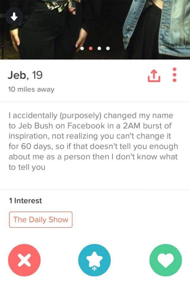Bio: I accidently (purposely) changed my name to Jeb Bush on Facebook in a 2AM burst of inspiration, not realizing you can't change it back for 60 days, so if that doesn't tell you enough about me as a person then I don't know what to tell you.
